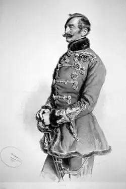 Only the right flank, led by Aristid Dessewffy, withstood the enemy cannon fire.[8] Dessewffy with the 26th Honvéd Battalion managed to stop the attack of the Imperial infantry, and with the Coburg Hussars he forced two enemy guns to retreat.[15] Dessewffy's 42nd Hussars almost reached the enemy's rocket battery on the Akasztófa hill, when the Archduke Wilhelm infantry, which had been in reserve, countered the Honvéd attack in time and even repulsed it with a successful counterattack.[9] At 3.30 p.m. Dessewffy's troops also wavered, but the Lieutenant-Colonel ordered the retreat to Enyicke in time, both for his own troops and for those of Major Rembowszky, who was fighting on his right.[9] It was up to these units - the 26th, 20th Honvéd Battalions, 1 Company of the 17th Honvéd Battalion (the latter two were subordinated to Dessewffy after the centre had been routed), the Polish Legion and the Coburg Hussars - to cover the retreat of the whole corps.[2][15] The biggest problem was the transfer of guns and ammunition wagons across the swift Miszlóka stream, which was made more difficult by the desperate fleeing of some troops, such as the Lehel Hussars, across the stream.[2]