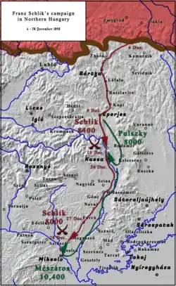 The outposts of both corps met on 27 December, and on 28 December the main forces of Mészáros and Schlik faced each other in the Battle of Szikszó.[8] Schlik advanced and Mészáros, fearing an outflanking, retreated towards Miskolc. Schlik, however, did not follow him but during the evening retreated towards Kassa.[8] Schlik feared that his troops would be attacked by the fanaticized Hungarian population if he continued to advance.[8] He also received news of an imminent Hungarian attack on Eperjes, and decided to concentrate his troops in Kassa.[8]