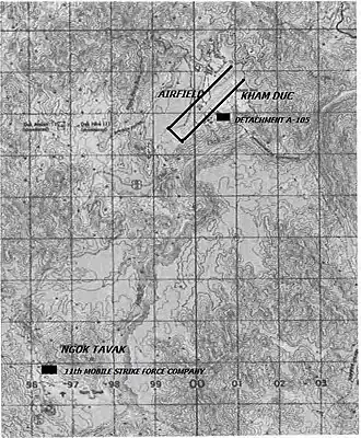 Khâm Đức was in the northern section of Quảng Tín Province, South Vietnam, in I Corps Tactical Zone. It sat beside National Highway 14 (QL 14), which paralleled the international border with Laos, surrounded by high mountains on all sides.[2]: 2 The Special Forces Camp was named after the main village which was about 800 meters (2,600 ft) to the northeast, and was constructed about mid-way along a 6,000-foot (1,800 m) asphalt runway. Before his abdication, Emperor Bảo Đại (and possibly Ngô Đình Nhu)[6]: 199 had used Khâm Đức as a hunting lodge, so the airfield was constructed there for Bảo Đại's use. The Khâm Đức Special Forces Camp was garrisoned by Detachment A-105, U.S. Army 5th Special Forces Group. The camp was downgraded from a major outpost due to its unpredictable weather[11]: 6 and now functioned as a training centre for Civilian Irregular Defense Group program (CIDG) personnel, reconnaissance of enemy movements, and combat operations.[2]: 2 [1]: 31 The village had 272 inhabitants, most of whom were dependents of the South Vietnamese and ethnic lowland CIDG soldiers. Ngok Tavak, about 7 kilometers (4.3 mi) southwest of Khâm Đức, was an observation outpost for Detachment A-105. Following the loss of Lang Vei, Khâm Đức was the last remaining Special Forces camp adjacent to the Ho Chi Minh Trail in I Corps.[12]: 541