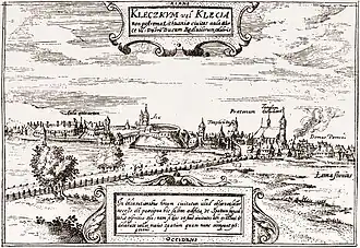 One of these counter-attacks was commanded by Carl Gustaf Creutz. He trapped a substantial number of Cossacks and Poles in the city of Lyakhavichy with his force of 2,000 men and besieged them. In response Mazepa then sent a relief-party of 4,700 soldiers. Initially they had been despatched to help those trapped in Grodno, but they were diverted to Lyakhavichy. After several days march they arrived at the city of Kletsk, some 25 kilometres (16 mi) east of Lyakhavichy, where they set up camp.[1] Creutz gained knowledge of this and set off against Kletsk with 1,500 cavalry, leaving 500 dragoons to continue the siege. They marched overnight and arrived at Klatsk the next morning.[1][4]