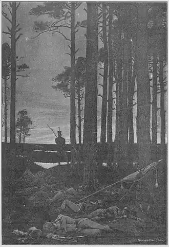 The Swedes resisted stubbornly, the artillery on both sides duelled near the highway while the infantry fought intensely out on the bog; some Swedish battalions counterattacked and pushed several Russian lines back, until their reserve gave them enough weight to repulse the Swedish attack. Jankovitj then reinforced his right flank with two battalions from the reserve — to encircle the Swedish left and gain access to the highway from behind — while his other battalions increased their activity at the front; this forced Fieandt to withdraw one kilometre, where he once again made a brief stand at a forest edge to buy time for the collection of wounded, before he eventually ordered a retreat towards Tunkkarin Silta, five kilometres away. The skirmish at Kokonsaari had proved to be one of the more intensely fought engagements during the whole war.[1] The Swedish casualty report mentioned 159 privates and seven officers killed or wounded, however, this number excludes missing (an additional killed and captured); it is therefore likely that the total casualties in dead and wounded reached a sixth of their fighting force, excluding the prisoners. The Russians had lost 16 officers and around 300 privates. The Swedish force had stood well up against the much larger Russian and their retreat had been executed in good order.[4]