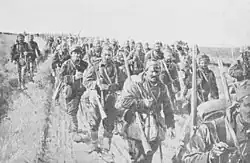Putnik reasoned that Austro-Hungarian supply lines would become overstretched as their forces pressed deeper into Serbia, while the Serbs would continue to hold the railheads in the Serbian interior.[23] On 10 November, he ordered a general retreat from the Jadar, withdrew the Serbian 2nd Army to Ub, and positioned the 1st and the 3rd Armies north and west of Valjevo.[24] Meanwhile, the Užice Army took up positions to defend the town from which it took its name.[23] The Austro-Hungarians pressed on after the Serbs and hoped to capture the Obrenovac–Valjevo railroad. Clashes ensued, and the Serbian army prevented the Austro-Hungarians from taking the railroad for a while.[24] It quickly became evident to Putnik that he had underestimated the Austro-Hungarians, who managed to bring their heavy artillery through the muddy Serbian country roads. They established firing positions on the Serbian side of the Drina and began targeting the Serbian army, which suffered heavy casualties. Morale plummeted amongst the Serbs, who were already significantly demoralized from a lack of cold-weather clothing and ammunition and were exhausted by the long retreat toward the Serbian interior. Putnik realized that his forces would need to regroup to provide effectual resistance. He ordered the abandonment of Valjevo and had the Serbian army take positions on the Kolubara.[23] The retreat towards the river was long and excruciating, with the Serbs being forced to destroy all bridges and telephone lines so they would not fall into Austro-Hungarian hands. The Serbian army also abandoned the bulk of its heavy equipment to speed up the withdrawal.[25] Seeing that the situation was critical and that Serbian forces lacked artillery, ammunition and supplies, Pašić sought the help of the Triple Entente. He sent a telegram to his envoys abroad, which read: "Urgent help is required. Beg and plead".[26] France provided the Serbs with munitions and supplies. Representatives of Russia and the United Kingdom "expressed understanding" but failed to deliver weapons and munitions.[27]