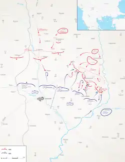 On the left Ottoman wing, a lot of reservists from Üsküb Infantry Division had deserted during the night, upon hearing that the Third Army had captured Pristina and that it was marching towards Skopje.[19] Still, at 5:30, VII Corps started the attack. However, Morava Division I counterattacked at 6:00 and with the arrival of Timok Division II from the rear they forced the entire Ottoman left wing to retreat.[20]