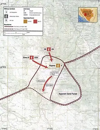 On 7 April, the bulk of the 9th Armoured Battalion arrived on the battlefield, adding 17 T-55s, eight M-60 APCs and five BVP M-80s. The unit entered Kupres in the late afternoon, followed by two battalions of the 13th Partisan Brigade. A battalion of the 11th Motorised Brigade performed mopping up operations in the Zlosela area. A part of the Bosnian Croat TO force was retreating in disarray, while a portion of the force was trapped in Kupres and Zlosela, trying to break out.[42] In the evening, as the mop-up of the Olovo and Osmanlije area was completed, the OG-11 ordered attacks against Gornji Malovan and Donji Malovan. The next day, the TG-1 received a commendation by the commander of the 9th (Knin) Corps, Major General Ratko Mladić.[37]