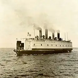 The Red Army forces defending the town were under the impression that the approaching ships were friendly vessels bringing in supplies. This allowed the ships to approach the harbor to a distance of approximately 4 kilometres (2 mi).[3] By the time the defenders of Mysovsk realized their error, it was too late. The ferry-icebreaker SS Baikal tried to initiate fire upon the Czechoslovak ships but they were faster. They began to fire, both at the Baikal and at the harbor. The Baikal was set ablaze and general confusion erupted in Mysovsk.[2][4] The train station was in flames. An armored train arrived after half an hour of Czechoslovak bombardment. Guns were offloaded from it and began to return fire upon the Czechoslovak ships. Since the main mission of destroying the harbor and train station were completed, the legionaries left the battle. On the return journey they met the enemy ship Angara which decided to evade battle. The rest of the journey was uneventful and they returned to Listvyanka without any further incidents.[3] The Baikal was run aground and left burning for some days before being towed and ultimately scrapped.