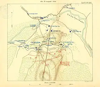 The Russian army under General Bibikov counted 2,150 men with six guns, while von Vegesack's total force numbered 5,400 men with 15 guns — although far from all the Swedish troops would be engaged in the forthcoming battle. On 29 August the Russians launched a fruitless attack on the Swedes; attempts were made to force the Swedish flanks to give way, but in vain. After four hours of fighting the Swedish commander ordered a counterattack which forced the Russians to retreat; the battle had played out much like the fighting the day earlier, at Nummijärvi. The Russians retreated with a loss of 153 men killed or wounded while 82 had been captured by the Swedes; who had sustained 113 killed or wounded.[1] The main Swedish army then fought the Battles of Ruona and Salmi, on 1–2 September 1808, which severely crippled the Swedish war effort in Finland.[3]