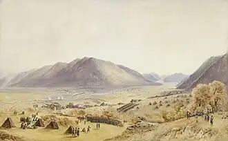 On 24 September, Jellacic marched from Sargans northwest to the Walensee and then west along its south shore to Mollis. He attacked Molitor's brigade the next day. This was the same day as Soult and Hotze were fighting on the lower Linth. Jellacic arrived in Soult's right rear, but was unable to dislodge Molitor's defenders in their positions along the upper Linth.[24] In addition to three battalions of the 84th Line, Molitor's force included three battalions of the 76th Line. Jellacic commanded one battalion of the Kaiser Infantry Regiment Nr. 1, two battalions of the Kaunitz Infantry Nr. 20, the Strozzi Light Battalion Nr. 1, the 2nd, 3rd, and 4th Battalions of the Peterwardeiner Grenz Regiment Nr. 9, the 1st Battalion of the Broder Grenz Nr. 7, and three squadrons of the Modena Dragoon Regiment Nr. 5.[17] Molitor counterattacked on 26 September after learning of Soult's victory. Jellacic began to retreat at 2:00 pm to Walenstadt on the western end of the Walensee.[24] Jellacic soon withdrew to Maienfeld in the Rhine valley. He lost 500 men captured. Other French and Austrian casualties are not known.[17]