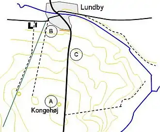 The scouts had been seen by the Prussians who had gone in cover with about 70 out of 124 men behind an earth dike in Lundby's south edge. From the burial mound Kongehøj about 500 metres south of the town, a long flat hill slopes down to the town. Beck ordered the company commander, Captain P.C. Hammerich, to carry out a strong determined bayonet charge from Kongehøj.
