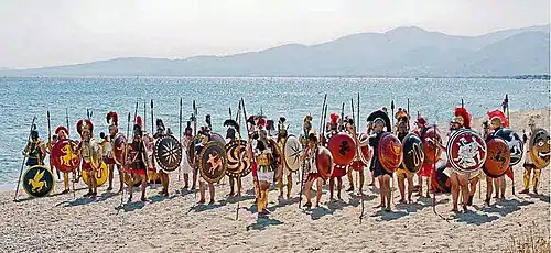 For approximately five days the armies therefore confronted each other across the plain of Marathon in stalemate.[33] The flanks of the Athenian camp were protected by either a grove of trees or an abbatis of stakes (depending on the exact reading).[36][37] Since every day brought the arrival of the Spartans closer, the delay worked in favor of the Athenians.[33] There were ten Athenian strategoi (generals) at Marathon, elected by each of the ten tribes that the Athenians were divided into; Miltiades was one of these.[38] In addition, in overall charge, was the War-Archon (polemarch), Callimachus, who had been elected by the whole citizen body.[39] Herodotus suggests that command rotated between the strategoi, each taking in turn a day to command the army.[40] He further suggests that each strategos, on his day in command, instead deferred to Miltiades.[40] In Herodotus's account, Miltiades is keen to attack the Persians (despite knowing that the Spartans are coming to aid the Athenians), but strangely, chooses to wait until his actual day of command to attack.[40] This passage is undoubtedly problematic; the Athenians had little to gain by attacking before the Spartans arrived,[41] and there is no real evidence of this rotating generalship.[42] There does, however, seem to have been a delay between the Athenian arrival at Marathon and the battle; Herodotus, who evidently believed that Miltiades was eager to attack, may have made a mistake while seeking to explain this delay.[42]