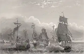 In order to cover the retreat of a convoy under Joseph de Flotte chased by the British, the lone 74-gun Annibal, under Lamotte-Picquet. For 90 minutes, Annibal single-handedly engaged the British squadron to block its advance, before she was joined by the two 64-guns, Vengeur and Réfléchi.[2] Ten to 11 of the transports were taken by the British or beached themselves to avoid capture, but the rest of the convoy of the escorting frigate Aurore managed to escape, and the division returned to its anchorage. Hyde Parker wrote Lamotte-Picquet a congratulation letter in the following days.[3]