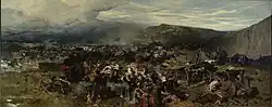 Koniecpolski had to lay several possible ambushes, as Khan Temir was a savvy tactician, and would not fall easily into a trap.[6] Eventually, he tricked the Tatars into attacking his lines, and after some feints by both sides, he managed to trick them into attacking a fortified tabor formation.[5] In order to entrap Khan Temir, Koniecpolski created the illusion that his forces were retreating, abandoning high ground and leaving some scattered wagons with supplies, suggesting disorder.[5] The Tatar attack was absorbed by the Polish cavalry, and a bloody battle ensued, which after about an hour caused the Tatars to break off.[7] Koniecpolski's then pursued them, before withdrawing again, this time luring Tatars into the artillery fire of the tabor formation.[7] This was followed by the charge of all 12 chorągiews of Polish cavalry. In the ensuing retreat, many Tatars drowned in the Dniestr river or nearby muds, and Khan Temir was wounded.[7] Polish forces pursued the fleeing Tatars, and were able to free most of the people the Tatars had captured and were leading into slavery (jasyr).[8] The Polish pursuit ended on the night of 20 to 21 June.[8]
