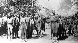 After suffering some early blows, ELAS managed to recover its influence, and from 1944 conducted constant sabotage on the supply routes used by the German army.[37][41] In April 1944, Meligalas became the first town held by a German garrison to be attacked by ELAS, but the assault was beaten back.[42] In the same month, EAM leader Georgios Siantos, following reports of indiscipline among the partisan forces in the Peloponnese, sent Aris Velouchiotis there as representative of the Political Committee of National Liberation (PEEA), EAM's newly established parallel government. Velouchiotis' task was to reorganize the 3rd ELAS Division, with a total strength of some 6,000 men.[43][44][45] They were facing 18,000 German soldiers and 5,000 Battalionists.[46] Velouchiotis quickly imposed strict discipline, managing to reverse the decline in partisan numbers and increase the number of their attacks on enemy targets.[47] The deterioration of the military situation led Felmy to declare the Peloponnese as a combat zone in May, which allowed Le Suire to in turn declare martial law, limiting the civilian population's freedom of movement and assembly.[48][49] Nevertheless, the sweeps and reprisals by the Germans and their collaborators were not enough to reverse ELAS penetration of the countryside in Messenia and neighbouring Laconia.[50] In the area of Kalamata, where during the occupation thousands of homes were torched and about 1,500 people had been executed, the reprisals of the Security Battalions continued until late summer.[51] Following the assassination of Georganas by the OPLA of Kalamata, a para-military organization of the EAM movement with police duties aiming to punish collaborators, in June, Smyrlis executed 27 communists in retribution.[52][53] In late August, while clashes between the ELAS and the Germans had decreased, those between ELAS and the Security Battalions increased steadily.[54]