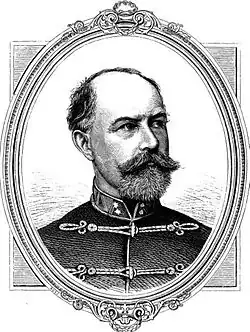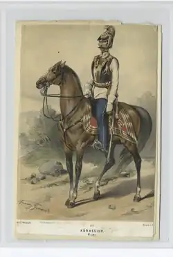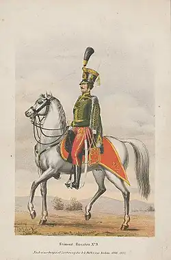 The sound of the cannonade soon alarmed the divisions from the camp, of which the Aulich and Guyon divisions were the first to prepare for counter-attack.[3] The cavalry of the Kmety, Guyon and Aulich divisions were waiting for their commanders in order, and, with Poeltenberg's division returning from one of their attacks, they went on the attack on the right flank.[4] The first help to Kmety was provided by a detachment of the Nicholas Hussars,[3] under the command of Colonel András Gáspár.[2] Opposing him was his former commander, but there were several other officers of the Imperial Cavalry too who had been his comrades back in 1848.[2] Kmety's division was joined in the attack by one company of Hunyadi Hussars and 4 companies of Wilhelm the Hussar.[2] At the same time as the attack began, the cavalry battery also advanced, and its six guns, along the highway, began to fire successfully at the enemy.[2] In the meantime, the Hungarian hussars, with the Nicholas hussars on the right and the Wilhelm hussars on the left, attacked the cuirassiers.[2]