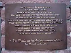The Battle of Mingolsheim (German: Schlacht bei Mingolsheim) was fought on 27 April 1622, near the German village of Wiesloch, 23 km (14 mi) south of Heidelberg (and 8 km or 5 mi south of Wiesloch), between a Protestant army under General von Mansfeld and the Margrave of Baden-Durlach against a Roman Catholic army under Count Tilly.