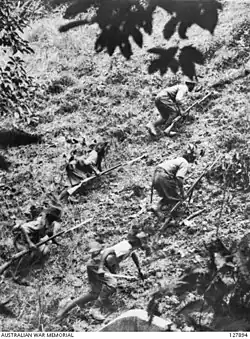 The ambush occurred at about 16:00 on 14 January, when Japanese troops from the 5th Division approached, mounted on bicycles, and crossed the bridge unharassed.[15] Then came the main column, several hundred strong, also cycling, which was followed by tanks and engineer trucks. At this point, the bridge was detonated, sending timber, bicycles and bodies hurtling through the air. B Company, 2/30th Australian Battalion spread out along either side of the road, concealed in well-protected firing positions, then opened fire and the Japanese column took devastating blows as row upon row of men and equipment were mowed down by machine gun and rifle fire. Most of the Japanese troops tied their rifles to the handlebars of their bicycles making the ambush even more successful for the Australians.[9]