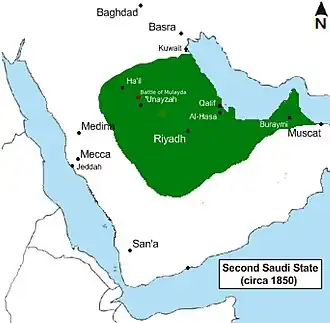 The Battle of Mulayda was the last major battle during the period of the Second Saudi State which occurred on 21 January 1891.[1] Following problems over Zakat and the arrest of the Rashidi leader, Ibn Sabhan, the Rashidis planned to end the Saudi State and conquer both Qassim region and Riyadh. The Rashidis and their Arab ally clans successfully ended the Second Saudi State, forcing the House of Saud, led by Abdul Rahman bin Faisal, and their allies to flee.[2]