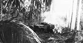 ![]() U.S. Army soldiers attack Japanese fortifications with flamethrowers on or around 1 August 1943 during the battle for the airfield. | |||||||