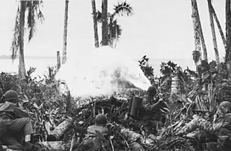 Inland, the U.S. troops advanced towards Bilbao Hill. In the center of the frontline, the U.S. infantrymen were supported by six tanks from the 10th Defense Battalion that had recently arrived from the Russell Islands,[30] and attacked with flamethrowers, small arms and grenades. Two Marine tanks were destroyed in this fighting while the others were forced to withdraw, and over the course of the next couple of days heavy fighting occurred. Even when pillboxes were overrun, invariably one defender remained to fight to the death.[31]