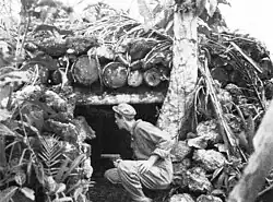 Across a frontage of around 3,200 yards (2,900 m) the Japanese defenders had established a series of defenses along a northwesterly axis from the beach at Ilangana. These defenses consisted of strong pillboxes and fortifications amidst thick jungle. These dominated several high features including Shimizu Hill, Horseshoe Hill, Kelley Hill and Reincke Ridge.[25] Situated to provide mutual support, the pillboxes were well constructed with coral and coconut logs. Dug-in several feet beneath the ground, they were well camouflaged and only a small part showed above ground with firing points for machine gunners and riflemen.[26]