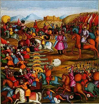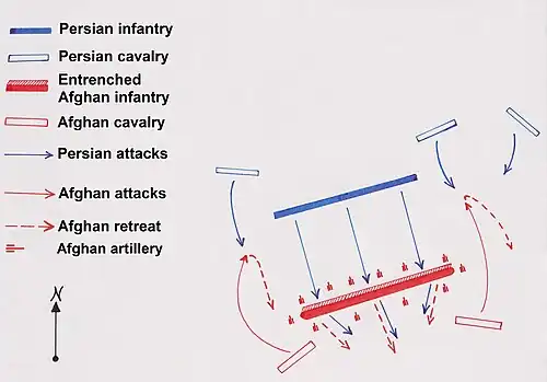 No effort was spared by Ashraf to try and relieve the pressure from his infantry in the centre and many charges were made by his cavalry against the Iranian infantry's flank and rear but were all intercepted and thrown back by Nader's cavalry reserve.[5] Eventually the centre of the Afghan army dissolved under pressure and Ashraf having done his utmost to keep order amongst his unravelling army was forced to concede another crushing defeat, leading him to flee with the utmost urgency in order to reach Isfahan before Nader.