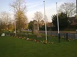 The surrounding area of the site of the battle has changed and developed significantly since the time of the battle in 1642. Muster Green can be made out on the 1638 Manorial Map of Great Haywards Demesne and is surrounded by fields but little development.[7][8] With the coming of the London & Brighton Railway in 1841, Haywards Heath began to urbanise exponentially and Muster Green saw itself slowly encroached upon by newer and newer buildings. Today, Muster Green is completely enveloped by urban sprawl, however, its shape has not changed as historically it was a green space between two diverging roads (the B2272 in the south and Muster Green North in the north).[15] Muster Green nowadays is a well maintained village green and has been awarded the Green Flag Award numerous times for being "one of the very best in the world". Haywards Heath war memorial is also located on the westernmost point of the green.[16] An informative and commemorative plaque on a lectern is situated on the easternmost point of the green describing the Battle of Muster Green. This was installed by the local council at the recommendation of historian Philip Pavey in June 2015, although, the plaque commemorates the Battle of Muster Green as the Battle of Haywards Heath.[10][14]