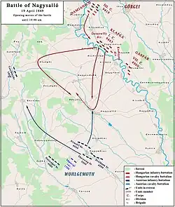 At dawn on 19 April, Wohlgemuth ordered Strasdil's brigade to attack Nagysalló, Kissalló and Hölvény[20] (two villages around it, which became years later parts of Nagysalló), which they accomplished, chasing Klapka's vanguard out of from there.[21] Klapka, when he heard the gunshots, immediately rushed to Hölvény,[10] where after reorganizing these units, and bringing the rest of his corps northwest from Nagysalló,[20] he decided to retake the place and also informed Damjanich and Gáspár about the start of the battle.[21] Hearing about the situation Damjanich immediately sent the Wysocki division to help Klapka's counter-attack.[10] When the Wysocki division arrived, at 9 a.m. Klapka ordered the counter-attack as follows: the Dipold brigade of the Dessewffy division had to advance, through the Hölvény woods, to the Zálogos forest southeast from Nagysalló, the Kazinczy division had to push on the carriageway towards the northern entrance of the village, on their left the Wysocki division had to attack Nagysalló from the northeast, while General József Nagysándor with the bulk of the cavalry, formed of 6 cavalry companies of the I. corps and the cavalry of the III. corps, had to secure their left. As reserve remained the Bobich brigade of the Dessewffy division at the Hölvény forest, holding also the heights north of Fakóvezekény, and the Knezich division of the III. corps took position north of Hölvény.[10]
