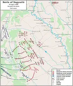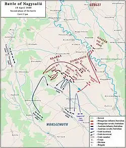 An hour later also Damjanich arrived on the battlefield in the middle of the deployment of the troops, and gave the order, accordingly to Klapka's plans, to start the attack.[10] The action began at 10 o'clock with a heavy artillery duel,[22] and although the Austrians were in a very good defensive position, unleashing a devastating cannonade against the attackers, the Hungarian I. corps retook Hölvény and Kissalló, forcing the Austrian units from there to retreat to Nagysalló[20] During these heavy fights the two villages caught fire.[20] Then the Czillich and Leiningen brigades of the III corps Wysocki division, together with the Kazinczy division of the I. corps, attacked Nagysalló from the northeast and north, and recaptured it after heavy bayonet combat around 11 o'clock.[20] In the fight to recapture Nagysalló one of the most feared Hungarian units, the 3. "white feathered" battalion distinguished itself under the leadership of their equally famous commander lieutenant colonel Károly Földváry (the hero of the battles of Tápióbicske and Vác), by executing a bayonet charge against the enemy battalions, and pushing them in a back street, where they crammed, being massacred by the 3. battalion. The attack of the Hungarians caused the Austrians to rout, being chased by the Hungarians until the edge of the village.[23] General Damjanich, in his battle report, wrote that the streets of Nagysalló were filled with dead bodies after the fight,[20] and the Strasdil brigade retreated to the heights northwest of Nagysalló.[10] During the attack of the Wysocki divisions infantry, the cavalry, supported by the cavalry batteries, attacked the Austrian artillery units positioned at the southeastern edge of Nagysalló, routing them completely.[20]