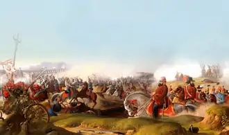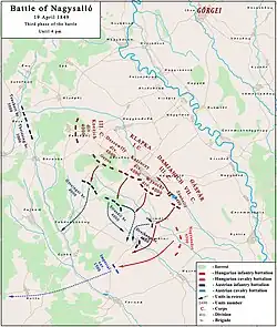 Around 3 o'clock, when the cavalry, slowed down by the wet and swampy terrain, finally took their position, János Damjanich gave the order for the decisive attack against the Jablonowski division.[10] Seeing his troops’ lack of success, Wohlgemuth was thinking of retreating, but he was waiting for Veigl's and Perin's brigades advancing from Bese and Köbölkút towards Jászfalu, to join his main body. However, at this very moment the cavalry and a cavalry battery of the Hungarian VII Corps, led by Colonel Ernő Poeltenberg appeared on his right flank.[21] The VII Corps had started to cross their bridge over the Garam at Zsemlér as soon as it was ready, at 7 o'clock in the morning. Hearing the gunfire, Gáspár urged his troops to hurry across and join the battle. He ordered them into battle to the left of Nagysalló: the artillery and cavalry to support the III Corps, one of Poeltenberg's brigades being sent in Nagysalló to observe the road towards Zselíz.[21] Those of his troops who crossed after this also marched towards Nagysalló. Two Hungarian battalions tried to outflank the village from the left, while the attack of the Waldberg brigade forced the remaining imperial troops to retreat from it.[24] The Hungarian artillery fired so effectively upon the enemy artillery that this was forced to retreat.[21] The retreating imperial artillery tried to redeploy further back, but after the VII Corps sappers had bridged two ditches for it, the Hungarian artillery advanced and drove the imperial guns away again.[25] Thus the 4th Sándor Hussar Regiment led by Poeltenberg, together with the cavalry of III Corps under General Nagysándor, and a horse artillery battery obliterated the imperial cavalry on the left flank at Nagymálas.[22][26]