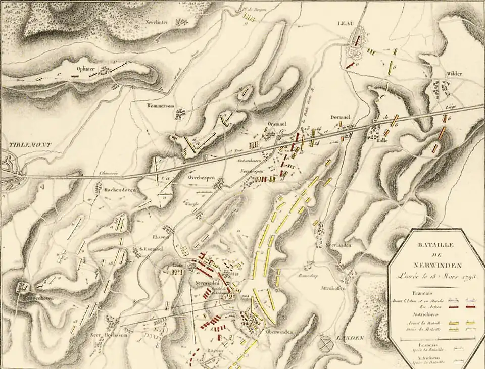 On 6 November 1792, a French army under Charles François Dumouriez defeated the Austrian army of Duke Albert of Saxe-Teschen at the Battle of Jemappes. The French enjoyed an enormous numerical superiority with 40,000 infantry, 3,000 cavalry and 100 guns against an Austrian army counting 11,628-foot soldiers, 2,168 horsemen and 56 guns.[1] Within one month the French armies overran most of the Austrian Netherlands, a territory known today as the nation of Belgium. On the right flank, the Army of the Ardennes led by Jean-Baptiste Cyrus de Valence advanced down the Meuse River toward Huy. On the way, Valence dropped off a force under Louis-Auguste Juvénal des Ursins d'Harville to besiege Namur. Dumouriez himself with the Army of Belgium captured Liège. The Army of the North commanded by Francisco de Miranda laid siege to Antwerp. It was joined by a column under Benôit Guérin de Berneron that marched first from Ath northeast to Leuven (Louvain).[2]