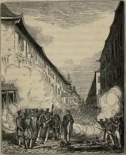 The Chinese attacked the southern and eastern city walls, overwhelming the British soldiers stationed at the southern city gate.[9] At the western city gate, a group of Chinese soldiers under the command of Tuan Yu-Fang approached the walls, and upon seeing that the gate was opened and seemingly undefended, were ordered to capture it by Tuan. However, the British had mined the gate and deliberately left it open "in order to give the impression that they did not mean to defend it", and one hundred attacking Chinese soldiers were killed in the ensuing blast, forcing them to call off the attack.[15] Meanwhile, at the southern city gate, the attacking Chinese had pushed back the British soldiers stationed there into the city streets, but were eventually repelled by 150 British soldiers under the command of Sir Hugh Gough, with the British deploying a field artillery piece directly in a city street.[16] British and Chinese officials alike noted that many of the Chinese soldiers were under the influence of opium during the battle, which notably decreased their combat effectiveness. The Chinese retreated, having suffered between 500 and 600 casualties while the British suffered 5.[17] Historians have noted that heavy rains and mud had delayed the Chinese from swiftly bringing in reinforcements before and during the battle.[9]