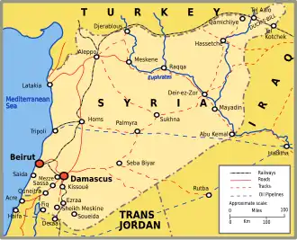 In 1941, the Vichy French had substantial forces in the region and had allowed their air bases to be used as staging posts by the Germans to send aircraft to take part in the Anglo-Iraqi War. They had also allowed the Germans to use the railway system to send arms and ammunition to Iraq.[1] On 8 June 1941, the Allies had launched two northerly attacks from Palestine and Trans-Jordan into Lebanon and Syria to prevent any further interference with Allied interests in the region. By late June, Damascus had been taken, and the Allied campaign commander, Henry Maitland Wilson, was ready to launch two further thrusts, this time from western Iraq to complete the capture of Syria.