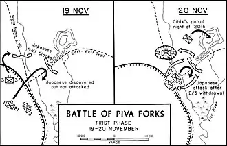 On the morning of 20 November, the Japanese counterattacked and attempted to outflank the Marine positions along the Numa–Numa Trail. The attack was driven back, taking up positions and then harassed the Marines with sniper fire and mortar fire. The 3rd Battalion, 3rd Marine Regiment advanced towards the two forks of the Piva River to clear the threat, and two light tanks were disabled during the close fighting along the trail.[10] The 3rd Marine Raiders took up positions to cover the gap between the 129th Infantry Regiment and the 3rd Marine Regiment as the front expanded.[10]