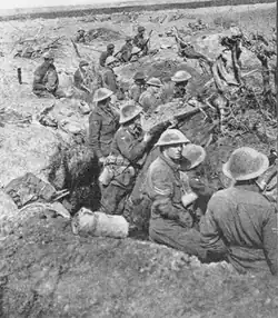 The leap-frog method was chosen for the September attacks, whereas in July and August both methods had been used.[25] Intermediate objectives closer to the front line were selected and the number of infantry attacking the first objective was reduced, since the German garrisons in the forward defended areas were small and widely dispersed. A greater number of units leapfrogged through to the next objective and the distance to the final objective was further reduced, to match the increasing density of German defences; the creeping barrage slowed as it moved towards the final objective.[26] Particular units were allotted to mop-up and occupy areas behind the most advanced troops, to make certain that pockets of Germans overrun by the foremost troops were killed or captured, before they could emerge from shelter and re-join the battle. Increased emphasis was placed on Lewis-guns, rifle-fire and rifle-grenades. Hand-grenades were given less emphasis in favour of more rifle training. The proportion of smoke ammunition for rifle grenades and Stokes mortars was increased, to blind the occupants of German pillboxes as they were being surrounded. All units were required to plan an active defence against counter-attack, using the repulse of German infantry as an opportunity to follow up and inflict more casualties.[27]