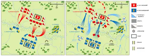 Following several days of minor battles, Khmelnytsky led his army on the morning of 13 September 1648 shouting: “For the faith, brave warriors, for the faith!", killing many Polish cavalrymen as they fled back across the Ikva.[6]: 474 That night, the Polish commanders decided to retreat in corral formation to Starokostiantyniv, but while preparing for this retreat the next day, they would hold their position and fight under Wisniowiecki's command.[6]: 475 However, "rumours began curculating among the troops ... that the commanders had abandoned the camp and taken flight, and fear was turned into wholesale panic".[6]: 475 "Everyone else began to flee, leaving behind wagons, cannon, and all kind of supplies, only the sick and maimed remained", not stopping at Starokostiantyniv, Koniecpolski went to Brody, Ostroróg to Olesko, Zaslawski to Vyshnivets.[6]: 475