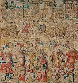 The battle was fought in Raichur between the armies of Krishnadevaraya and the Sultanate of Bijapur.[7] The main commander of the Vijayanagara army was Saluva Timmarusu also known as Saluva Timma.[10] The Vijayanagara Empire had a force consisting of 32,600 cavalry and 551 elephants according to contemporary sources. Initially, Pemmasani Ramalinga Nayaka led the vanguard with 30,000 infantry, 1,000 cavalry, and few war elephants. He was followed by commanders like Hande Mallaraya, Timmappa Nayaka, Adapa Nayaka, and Ganda Raya, other notable leaders included Jagadeva, Rayachuri Rami Nayudu, and Kumara Virayya. The Bijapur Sultanate had a force consisting of 7,000 cavalry and 250 elephants. Modern and contemporary writers disagree on the number of infantry personnel that each side had. The contemporary sources say that Krishnadevaraya had an infantry force consisting of a bit over 700,000 soldiers.[11] Adil Shah, with a 120,000 foot, 18,000 horses and 150 elephants strong army, moved to relieve Raichur. Despite being outnumbered, his artillery advantage was significant. Upon reaching the Krishna River, he found it blocked by Vijayanagar troops. He then crossed the river and advanced towards Krishna's camp. Both armies prepared for battle and spent a night armed and ready. The next morning, Krishnadeva ordered an attack on the Musalmans, initially making progress but facing heavy artillery fire from the Bijapuris. The Hindu forces retreated in disorder, and Krishnadevaraya rallied his troops to counter-attack, ultimately leading to the enemy's panic and retreat.[12][13] Krishnadeva, the Vijayanagar leader, encouraged his remaining troops, vowing to die as soldiers instead of fleeing. He called for loyal officers, and together, they charged the enemy. This unexpected counter-attack caused the Bijapuris to retreat, leading to chaos and many casualties on both sides. The Vijayanagar army suffered over 16,000 dead, while the Bijapuris lost many, including Mirza Jehangir, and five important captains including Salabut Khan taken prisoners.[13] Upon seeing the enemy retreat, Krishna's generals sought permission to continue the battle. However, prioritizing peace, he ordered his troops to withdraw. After capturing the Bijapuris' camp, Krishna counted the spoils: 100 elephants, 400 cannons, tents, horses, oxen, and other animals. He released captured women, honored the fallen with funeral rites, and distributed alms. With the battle concluded, Krishna returned to the siege of Raichur.[13] Moreover, the use of a Portuguese contingent[14] commanded by Cristovão de Figueiredo[4] with the use of fireweapons helped to conquer the fortress.[15] There is a high probability that matchlocks, which were obtained through contact with the Portuguese, were used as well by the army of the Vijayanagara Empire.[16] Additionally, the Portuguese with their arquebuses picked off the defenders from the walls, and thus enabled the besiegers to approach close to the lines of fortification and pull down the stones. Driven to desperation, and their governor being slain, the garrison surrendered.[12] Portuguese accounts state that cannons were used extensively by the Bijapur Sultanate; the Vijayanagara Empire used them minimally, at best.[17] The Vijayanagara Empire emerged victorious despite the Bijapur Sultanate having superior firepower.[18]