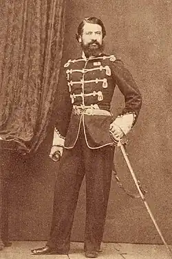 During the advance of the infantry, Hussars captured a gunpowder wagon that was rushing to Vargyas. After they had finished this action, some of the Szekler hussars - from the 9th Szentkatolna Company - attacked the enemy which was regrouping.[3] They were aided in this by the troops and artillery of Sándor Gál, who invaded the village.[16] Seeing this, the enemy was terrified, broke into two groups, and retreated. One part fled towards Alsórákos. The other half of the imperial infantry retreated along the highway, in the valley of the Rika stream,[16] to the edge of the forest and there tried to form a defensive position on a height.[3] They were supported in this by the Dragoons, who had developed into a skirmish line in front of them.[3] 9 of the Székely hussars from Szentkatolna attacked them in a skirmish line.[16] The two guns led by Áron Gábor started firing at a large crowd of Romanian pikes carrying militiamen gathered on a hill south of the Rika River, causing them to rout.[12] It is worthy to note that the account of the former artillerist Major Sándor Demeter, who described this stage of the battle in an article in the newspaper Vasárnapi Újság in quite a romanticised, literary manner, like it was a real armed clash between the two sides,[17] is contested by his fellow artilleryman Major Zsigmond László,[12] as well as Lieutenant Colonel Ignác Kovachich Horváth, who was leading the right wing of the Székely troops, both saying that Heydte's army started to flee immediately after the hussars attacked and the two guns of Áron Gábor started to fire.[5] The horsemen of the two sides fired at each other with their pistols and carbines, while Horváth, with his own company of Mátyás Hussars, tried to support the Székely Hussars.[18] After a short fight, the dragoons began to retreat, but further back, at a swampy ditch, they stood up again and tried to hold their ground.[4] They were followed by the 9 hussars from Szentkatolna, who crossed the bridge over the Rika.[16] Soon after, however, word came to Horváth, that the 9 hussars were under attack by the enemy and they are in danger.[16] Later, Captain Horváth wrote that the 9 hussars, surrounded by a platoon of dragoons, confronted them, killing two and wounding several. But it was feared that they would not be able to hold against this overwhelming force for long.[16] Horváth, however, was afraid to let the Mátyás hussars into the forest, for he feared that the enemy had set a trap for his hussars. He knew that in a steep river valley surrounded by wooded hills, the Hussars were very vulnerable.[16] He wanted to send the infantry after them, but they were reluctant to advance, saying that beyond the Rika was the territory of Udvarhely Seat, if they crossed the bridge they would attack across the border of their administrative unit, but their mission was only to defend their homeland, and not attack another region.[16] Horváth scolded them, threatening them with court martial.[16]
