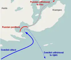 While preparing for the attack Hjelmstjerna neglected to guard the narrow passage that led from Rimito Kramp towards Turku. During the night little before planned Swedish attack the Russians fled to Turku where they were further reinforced in addition to being supported by three 24-pounder artillery batteries. Though Swedes had forced the Russians with retreat they had failed to inflict defeat to the Russian coastal forces.[1]