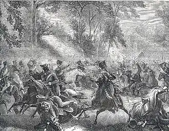 On quitting Versailles, the Prussian Hussars were fired upon by the National Guard from the barrier. They had not proceeded far when word was brought in that Prussian and British cavalry were approaching from the side of Saint-Germain; but it turned out to be a false report as what had been observed was the 1st Regiment of French Chasseurs. In the next moment the Prussian Hussars were formed for attack, and charged at a gallop.[9]
