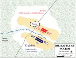 The French army was arranged in two lines of infantry in the center, squadrons of cavalry on each wing, and a thin line of artillery at the front. The Spanish army was similarly positioned but with the center infantry in their traditional "tercio" squares, with some 8,000 highly trained Spanish in front and mercenary infantry behind them.[5] The two armies exchanged fire in the afternoon of 18 May, but the full battle did not occur until the following day.