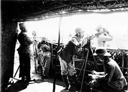 The next day, 33 German dead were buried by the 188 remaining crewmen. A plaque reading "Beim Untergang S.M.S. Königsberg am 11.7.15 gefallen..." ("Killed in action during the sinking of SMS Königsberg on 11 July 1915...") was placed near the graves, followed by a list of the dead. The Germans recovered Königsberg's ten 105-millimetre (4.1 in) quick-firing guns, mounted them on improvised field carriages, and used them with great success as powerful field guns in their guerrilla campaign against the Allies around East Africa. The guns were used as harbor fortifications in Dar es Salaam, with one being remounted onto the passenger ship Graf von Götzen. The last gun was not knocked out until October 1917.[9] The remaining crew from Königsberg went on to serve as ground troops under General Paul von Lettow-Vorbeck.