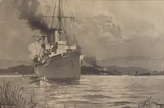 ![]() German cruiser “Königsberg” trapped by sinking of an English ship in the mouth of the Rufija River (illustration by P. Teschinsky, 1915) | |||||||