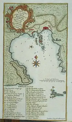 Knowles had initially intended to take his squadron and attack the Spanish at Santiago de Cuba, but contrary winds led to him deciding instead to attack the French Fort Saint Louis de Sud at Saint Domingue.[3][4] Shortly before midday on 22 March 1748 in HMS Elizabeth Knowles's led his squadron into the harbor of Port Saint Louis, completely surprising its defenders. An imposing seventy eight gun island castle guarded the road stead, manned by 310 troops and a company of black gunners under Governor Étienne Cochard de Chastenoye behind a twenty four foot-high stone walls.