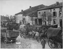 The American V Corps location was at the northwestern vertices, the II French Colonial Corps at the southern apex, and the American IV and I Corps at the southeastern vertices of the salient.[7] Furthermore, General Pershing's intent was obvious; to envelop the salient by using the main enveloping thrusts of the attack against the weak vertices. The remaining forces would then advance on a broad front toward Metz. This pincer action, by the IV and V Corps, was to drive the attack into the salient and to link the friendly forces at the French village of Vigneulles, while the II French Colonial Corps kept the remaining Germans tied down.[5] The French II Colonial Corps were successful in the attack on the apex and entered Saint-Mihiel on 15 September 1918, taking 4000 prisoners. They then pushed into the plain of Woëvre up to Haumont-Woël-Doncourt.