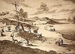 Almeida allowed his captains Pedro and Jorge Barreto to return to the village on the morning of 1 March 1510 with a force of around 150 men armed with swords, crossbows and spears and raided the village. The South African military historian Willem Steenkamp speculates that the ǃUriǁʼaekua allowed the Portuguese to advance inland so as to be able to engage with them at close quarters when they entered the heavily bushed areas more inland.[1] The Portuguese reached the village which they found deserted except for a few children and cattle,[1] which the Portuguese started abducting and stealing.[5][6][7]