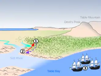 After winning the Battle of Diu in the Indian Ocean, Almeida sailed for Portugal in December 1509 and reached Table Bay near the Cape of Good Hope, where the Garcia, Belém and Santa Cruz dropped anchor late February 1510, to replenish water. There they encountered the local indigenous people, the ǃUriǁʼaekua Khoikhoi abaThwa/Khwe nation.[3] After friendly trade with the ǃUriǁʼaekua, a group of 12 or 13 of the crew members[1] visited their nearby village, situated in modern-day Observatory[4] or Mowbray.[1]