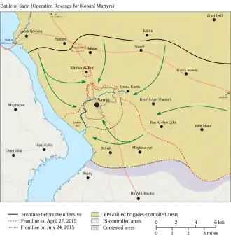On 20 March, the YPG and the allied Euphrates Volcano, backed by Coalition air support, launched an assault towards Sarrin,[36] which led to hit-and-run fighting until 28 March.[1][37]