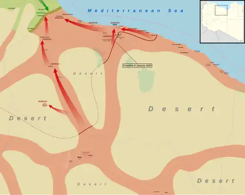 With the capture of Sirte, LNA forces looked next to the city of Misrata, located 250 kilometers to the northwest, while their brigades actively participated in the 2019–20 Western Libya campaign.[1][4]