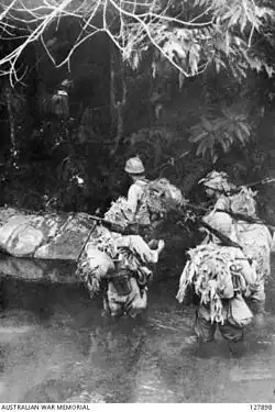 Like the Punjabis, the last battalion of Selby's brigade, the 2/1st Gurkhas under Lt. Col. Jack Oswald Fulton, were on the march either side of the road as the Japanese tanks reached them.[4] This time though, the marching column of Gurkhas were facing away from the approaching Japanese, and Watanabe's tanks caught them from behind: the death toll was even higher than that of the Punjabis. One officer and twenty-seven other ranks answered roll call the next day. Fulton, wounded in the stomach and taken prisoner, would die in captivity two months later.[3]