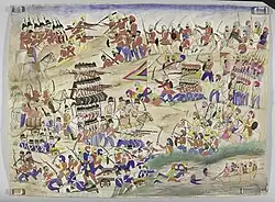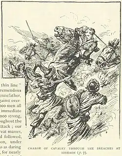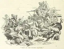 None of the trapped Sikh soldiers attempted to surrender. Many detachments, including one led by Sham Singh Attariwala, fought to the death.[6] Some Sikhs rushed forward to attack the British regiments sword in hand; others tried to ford or swim the river. British horse artillery lined the bank of the river and continued to fire into the crowds in the water. By the time the firing ceased, the Sikhs had lost between 8,000 and 10,000 men.[7] The British had also captured 67 guns.