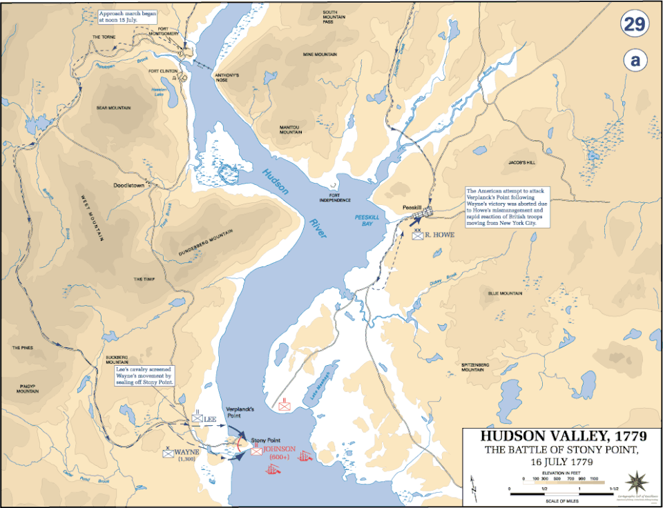 A roughly triangular promontory jutting into the Hudson river just below Peekskill, New York, with steep rocky slopes rising up to a 150-foot summit, Stony Point boasts formidable natural defenses. This made assaulting the position such a daunting task and prompted the nickname 'Little Gibraltar'.